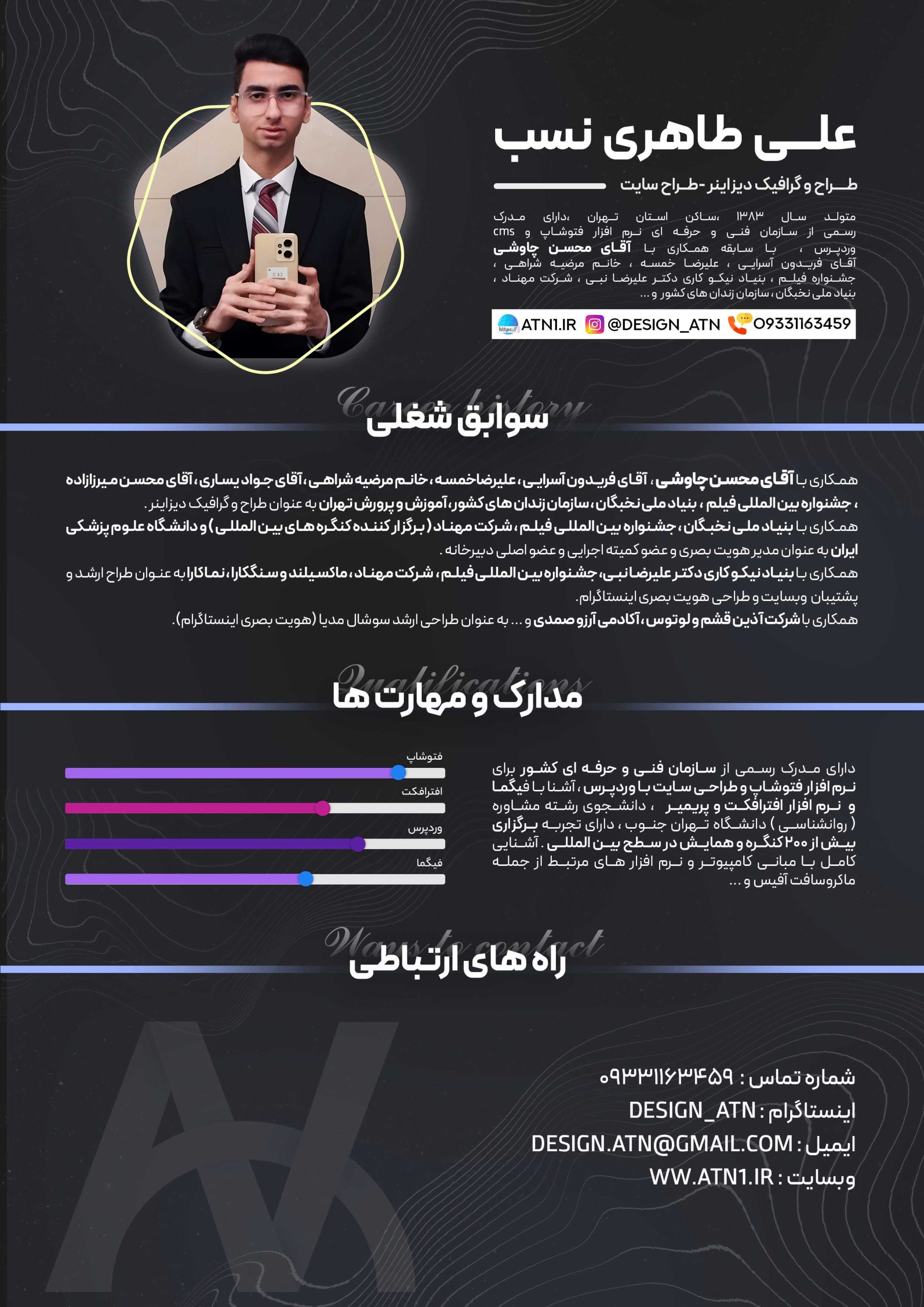سلام! من علی طاهری نسب هستم، طراح و وب دیزاینر با بیش از ۵ سال تجربه در زمینه طراحی گرافیک و وب. تحت نام برند ATN، خدمات متنوعی از جمله طراحی سایتهای اختصاصی، طراحی هویت بصری برای سوشال مدیا، و طراحی انواع اقلام چاپی مانند کارت ویزیت، سربرگ و پاکت نامه را ارائه میدهم.